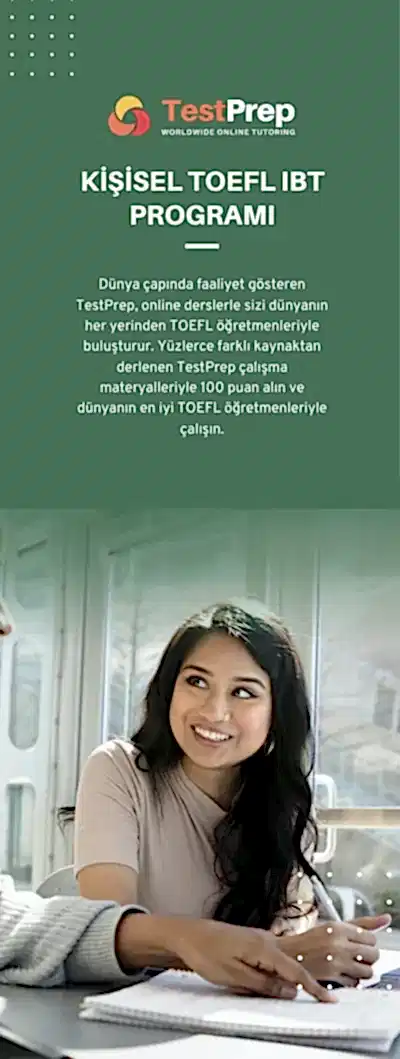 İngilizce yeterliliğinizi kanıtlamak için TOEFL iBT® sınavını seçtiğinizde, TestPrep TOEFL iBT kursları sizi bir adım öne taşır. TestPrep’in grup dersleri, TOEFL iBT puanı 120 olan uzman eğitmenler tarafından özenle hazırlanmıştır! TOEFL hazırlık kursları başladığında, sınavda en iyi performansı göstermenize yardımcı olacak online TOEFL sınav hazırlık kaynaklarımıza erişebileceksiniz.